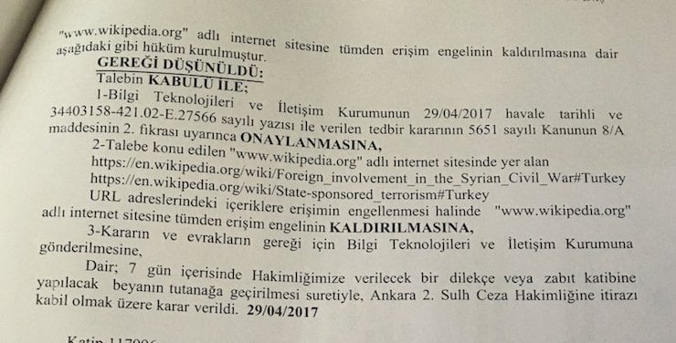 BTK’nın sitesinde şu bilgi yer almıştı: “5651 sayılı Kanun uyarınca yapılan teknik inceleme ve hukuki değerlendirme sonucunda bu İnternet sitesi (wikipedia.org) hakkındaki Bilgi Teknolojileri ve İletişim Kurumu’nun 29/04/2017 tarih ve 490.05.01.2017.-182198 sayılı kararına istinaden Bilgi Teknolojileri ve İletişim Kurumu tarafından İDARİ TEDBİR uygulanmaktadır.”