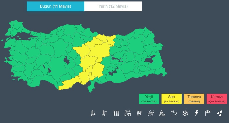 Sarı: Hava durumu potansiyel tehlikelidir. Tahmin edilen meteorolojik hadise olağandışı olmamakla birlikte, meteorolojik şartlardan etkilenebilecek faaliyetler konusunda dikkatli olunmalı.