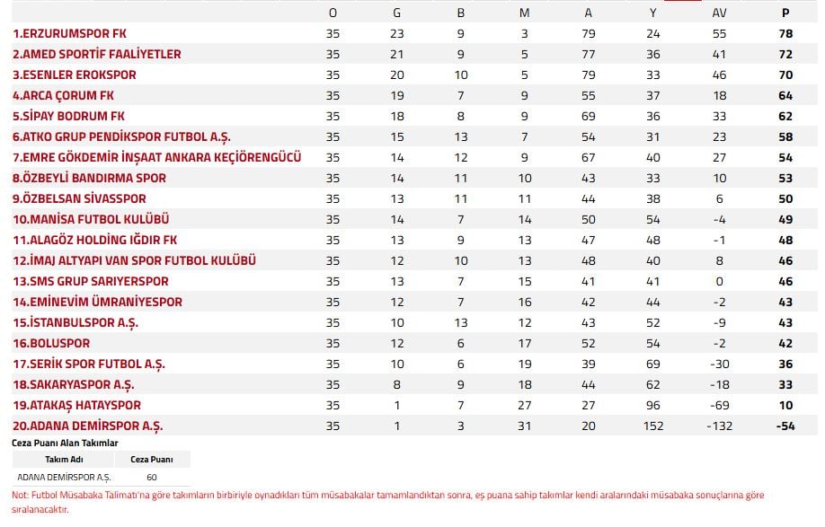 Üç ve yedinci sıradaki takımlarsa Süper Lig için play-off oynuyor.
