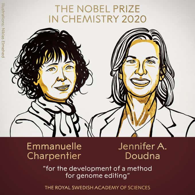 2020 Nobel Kimya Ödülü’nün sahibi, geliştirdikleri genom düzenleme metodundan dolayı Fransız profesör Emmanuelle Charpentier ve ABD’li biyokimyacı Jennifer A. Doudna oldu.