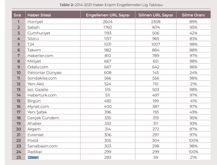 Verilere göre sansüre karşı en çok direnen ve hukuki mücadelesini sürdüren haber kuruluşu Diken, bu anlamda birçok pilot kararın alınmasına da öncü oldu.