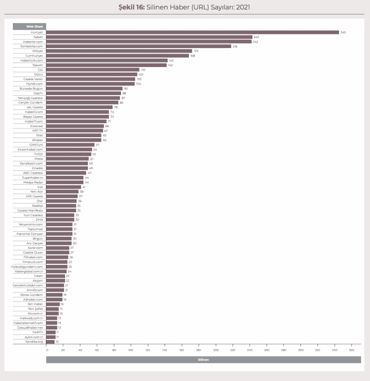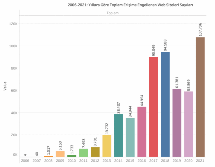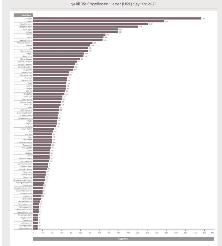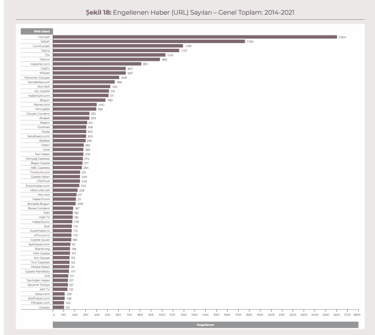 İstanbul Bilgi Üniversitesi Hukuk Fakültesi öğretim üyesi Prof. Dr. Akdeniz ve uzman araştırmacı Ozan Güven tarafından hazırlanan rapora göre 2021’de engellenen alan adı ve web sitesi 107 bin 706. 2021 sonu itibariyle de Türkiye’de toplam 574 bin 798 web sitesi ve alan adına erişim engeli geldi. Bu 789 farklı kurum tarafından verilen toplamda 504 bin 700 farklı kararla oldu.