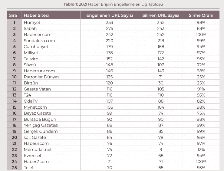 Raporda erişim engellemeleri lig tablosuna baktığımızda birinci sırada Hürriyet’in ikinci sırada Sabah’ın olduğunu görüyoruz.