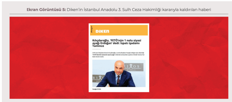 İFÖD raporunda şöyle dedi: “Fettah Tamince’nin talebiyle yaptırım uygulattırılamayan Diken’in bu haberi yaklaşık iki ay sonra bu sefer Cumhurbaşkanı Erdoğan’ın talebi üzerine İstanbul Anadolu 3. Sulh Ceza Hakimliği tarafından erişime engellenmiş ve yayından çıkarılmasına karar verilmiştir.”
