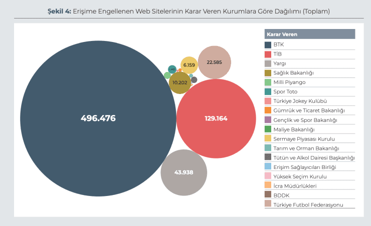 Grafikte de görüldüğü üzere 25’ten fazla farklı kurum ve kuruluşa çeşitli düzenlemeler altında erişim engelleme yetkisi veya talep etme yetkisi verildi. Bu yetkilerin çoğu ‘idari tedbir’ yoluyla ve yargı onayı şartı aranmadan Bilgi Teknolojileri ve İletişim Kurumu veya Erişim Sağlayıcıları Birliği’ne gönderilerek kullanılıyor.
