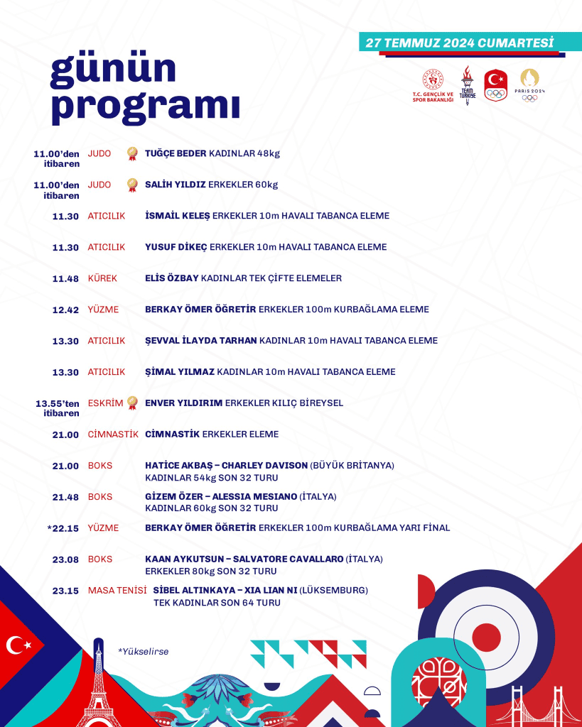 27 Temmuz’da ‘Team Türkiye’nin olimpiyat programı şöyle: