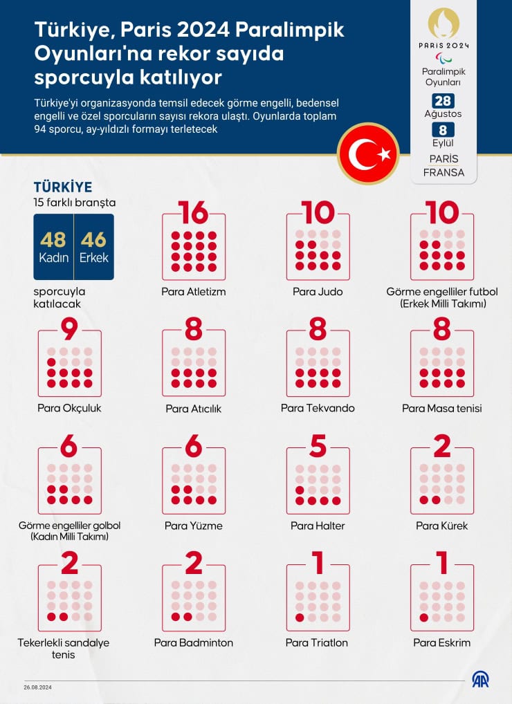 2024 Paris Paralimpik Oyunları 28 Ağustos ile 8 Eylül arasında düzenlenecek. Türkiye, 15 dalda 94 sporcuyla mücadele edecek.