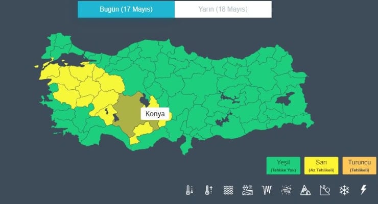 Sarı: Hava durumu potansiyel tehlikelidir. Tahmin edilen meteorolojik hadise olağandışı olmamakla birlikte, meteorolojik şartlardan etkilenebilecek faaliyetler konusunda dikkatli olunmalı.