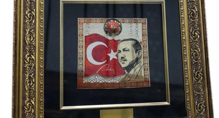 Bahçeli’nin hediye ettiği tabloda Erdoğan’ın resmi, imzası, Türk bayrağı ve cumhurbaşkanlığı forsu yer alıyor.