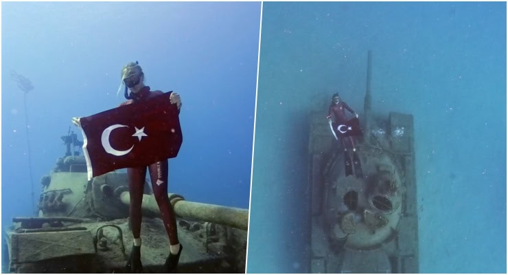 TSK’da ekonomik ömrünü tamamladıktan sonra Güvercin Adası yakınlarında 2017’de batırılan ve yaklaşık 15 metre derinlikte birçok deniz canlısının yuvası haline gelen 1960 model tanka dalış yapan milli sporcu, tankın üstünde Türk bayrağı dalgalandırdı.