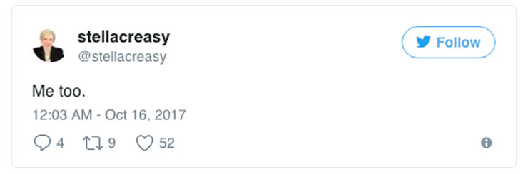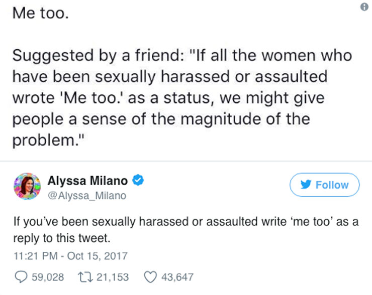 Angelina Jolie, Cara Delevigne, Kate Winslet, Asia Argento ve Gwyneth Paltrow gibi oyuncuların ABD’li film yapımcısı Harvey Weinstein tarafından tacize uğradıklarını açıklamalarının ardından kadınlar tacizin ne kadar yaygın olduğunu belirtmek için sosyal medyadan kampanya başlattı: ‘#Metoo’ (Ben de).