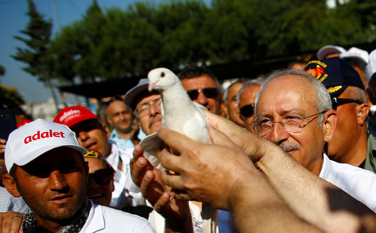 Kılıçdaroğlu, İstanbul il sınırı tabelası önünde güvercin uçurdu, fotoğraf çektirdi. Uçurduğu güvercin Kılıçdaroğlu’nun başına tekrar kondu.