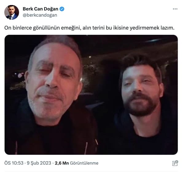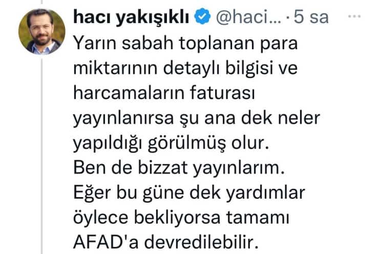 “Yarın sabah toplanan para miktarının detaylı bilgisi ve harcamaların faturası yayınlanırsa şu ana dek neler yapıldığı görülmüş olur. Ben de bizzat yayımlarım. Eğer bu güne dek yardımlar öylece bekliyorsa tamamı AFAD’a devredilebilir.”