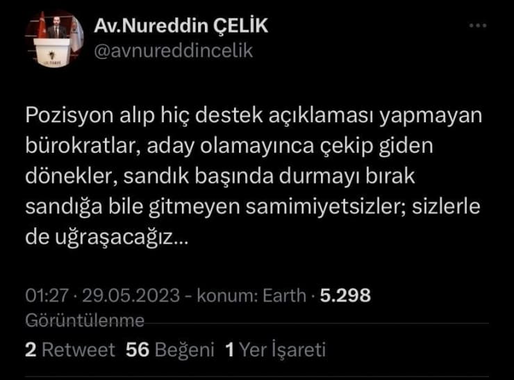 AKP’li Çelik Twitter’da, “Pozisyon alıp hiç destek açıklaması yapmayan bürokratlar, aday olamayınca çekip giden dönekler, sandık başında durmayı bırak sandığa bile gitmeyen samimiyetsizler; sizlerle de uğraşacağız” dedi.