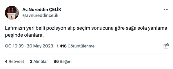 Çelik, son olarak “Lafımızın yeri belli pozisyon alıp seçim sonucuna göre sağa sola yanlama peşinde olanlara” paylaşımını yaptı.