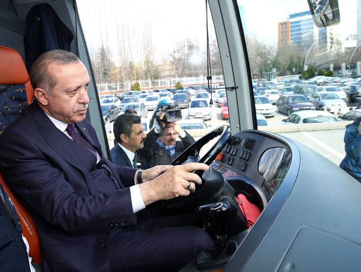 Yola çıkacak otobüslerden birisinin direksiyonuna geçerek bir süre kullanan Erdoğan, parti genel merkezi önünde partililerle fotoğraf çektirdi.