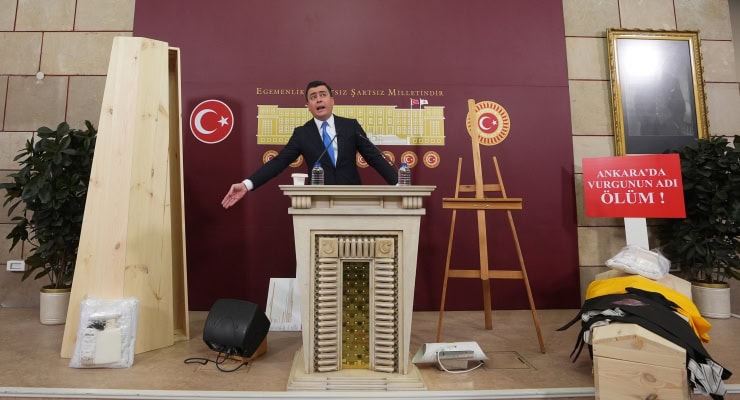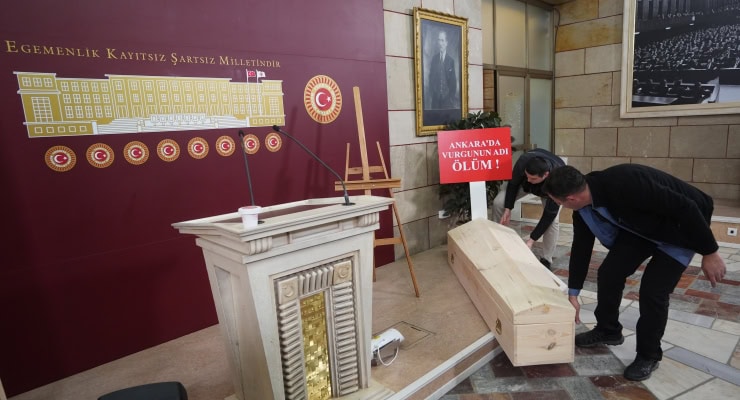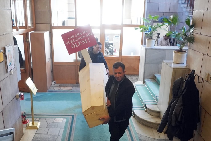 Gökçek, basın toplantısına ‘Ankara’da vurgunun adı ölüm’ yazılı pankartla çıkarken salona tabut, kefen takımı ve cenaze torbası getirtti.