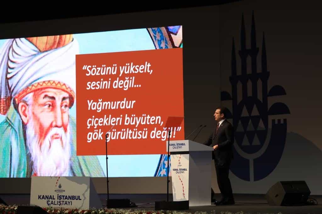 İmamoğlu, Mevlana’nın, “Sözünü yükselt; sesini değil. Yağmurdur çiçekleri büyüten; gök gürültüsü değil” sözünü anımsatarak, “Onun için; hepimiz, halkın, uzmanların ve bilim insanlarının sözlerine gönülden kulak verelim” dedi ve projeye neden karşı olduğunu şöyle açıkladı: “Kanal İstanbul, mecbur olmadıkça hiç kimsenin asla evet demeyeceği, çok büyük ve çok riskli bir ameliyat. Tamamıyla yanlış bir ameliyat. İstanbul kesip biçilecek. İstanbul’un hayati sistemleri zarar görecek. İstanbul’un bazı bölgeleri felç olacak. Kimi yerleri sakat kalacak. Bir şehri böyle riskli, böyle ölümcül bir ameliyata sevk edenler, ‘Siz ne derseniz deyin, bu ameliyat yapılacaktır’ diyemezler.“