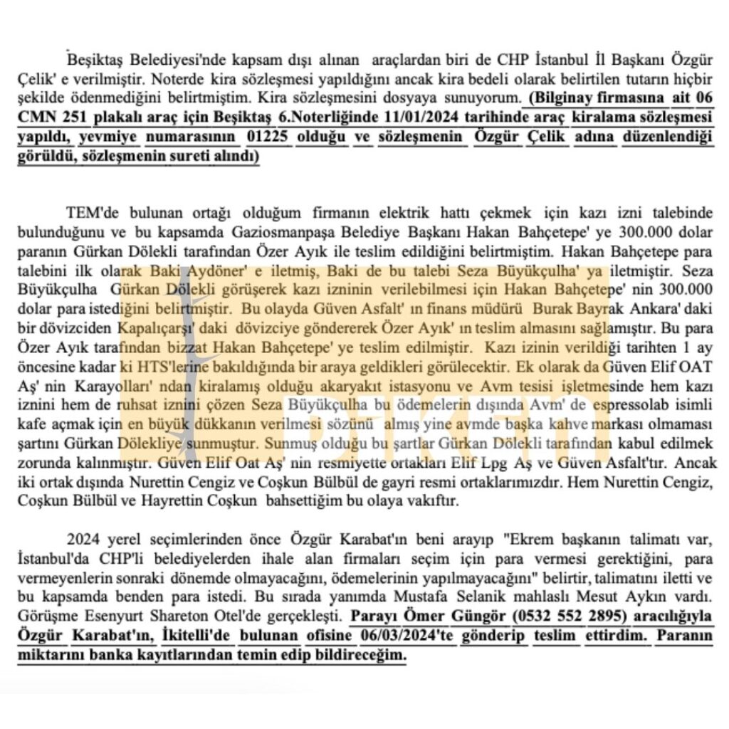 ‘Etkin pişmanlık’ kapsamında Aktaş ifadesinde Güven Elif OAT A.Ş.’nin Karayolları’nda kiralamış olduğu akaryakıt istasyonu ve AVM tesisi işletmesinde hem kazı hem de ruhsat iznini Seza Büyükçulha’nın çözdüğünü öne sürdü. Aktaş ifadesine şöyle devam etti: