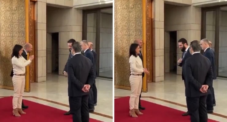 Avrupalı bakanları sarayda karşılayan Şara, Barrot’un elini sıkarken, Baerbock’un elini sıkmayarak elini göğsüne götürmüş, Baerbock’sa iki elini göğüs hizasına birleştirerek karşılık vermişti.