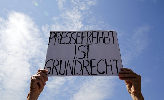 Ana Sayfa Almanlar basın özgürlüğüne sahip çıktı, devlete geri adım attırdı A demonstrator holds up an banner which reads "The freedom of press is a fundamental right" during a rally to protest against a criminal complaint by the domestic intelligence agency, the Office for the Protection of the Constitution, in Berlin