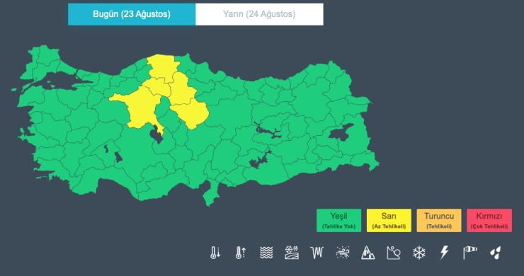 Sarı: Hava durumu potansiyel tehlikelidir. Tahmin edilen meteorolojik hadise olağandışı olmamakla birlikte, meteorolojik şartlardan etkilenebilecek faaliyetler konusunda dikkatli olunmalı.