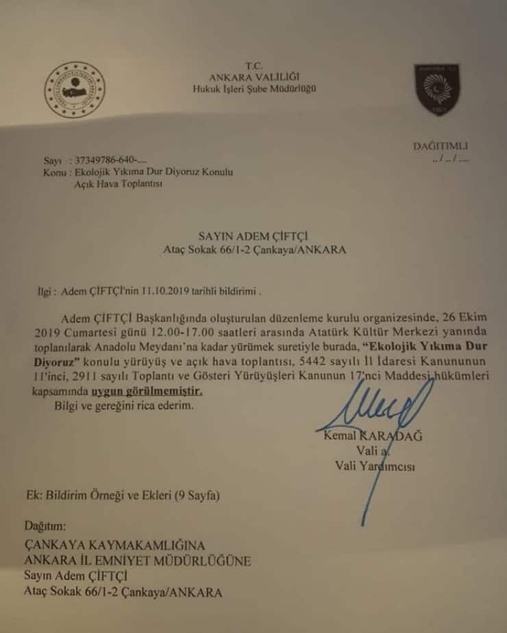 Ancak eyleme valilik tarafından izin verilmedi. Vali yardımcısı Kemal Kardağ’ın imzasını taşıyan yazıda, eylemin ‘uygun görülmediği’ kaydedildi.