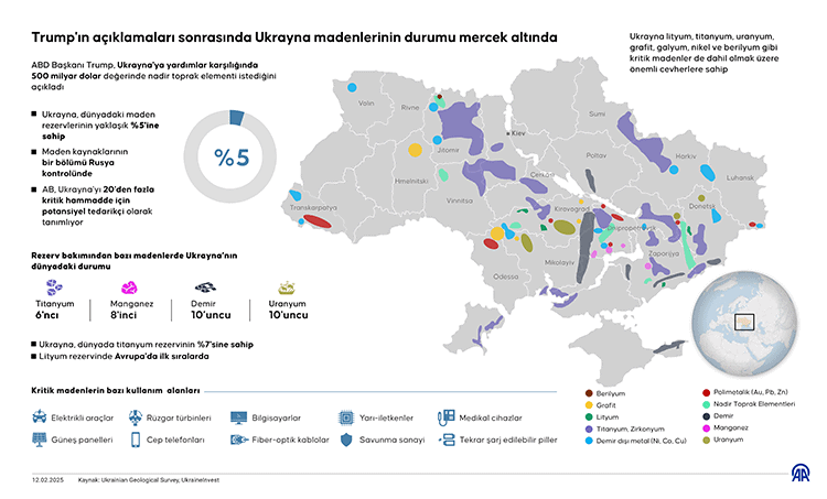 Ukrayna çoğu Avrupa ülkesinin aksine, çok çeşitli ve büyük mineral rezervine sahip. Özellikle titanyum, lityum, uranyum ve grafit yatakları bulunuyor ve bu elementler telefondan bilgisayara, elektrikli araca, uzay ve savaş teknolojisine, bataryaya kadar pek çok endüstrinin bel kemiği.