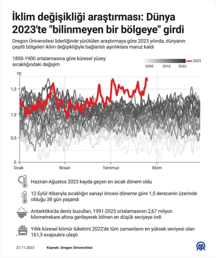 Raporda, Haziran-Ağustos 2023’ün şimdiye kadar kayda geçen en sıcak dönem olduğu, dünyanın temmuz ayı başlarında, şimdiye kadarki en yüksek küresel günlük ortalama yüzey sıcaklığını gördüğü ve 12 Eylül itibarıyla, sıcaklığın, sanayi öncesi döneme göre 1,5 derecenin üzerinde olduğu 38 günün yaşandığı bilgisine yer verildi.