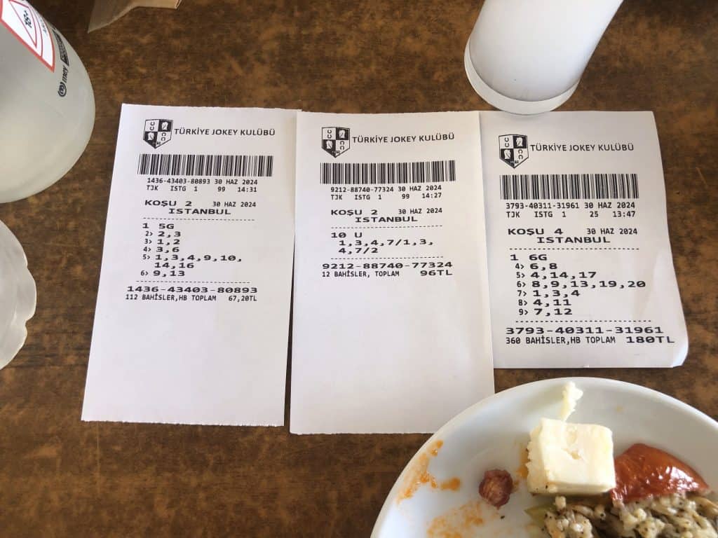 Restoranın içi dahil her yerde gişeler olduğu gibi; bir örnek giyinmiş bazı hanımefendiler de ellerindeki tabletten bahis oynatabiliyor. Kıydım paraya, bir ikili ya da sıralı ikili, hangisi bilmiyorum, bir de beşli ganyan oynadım. İkiliyi yandaki masada oynayan beyefendilerin kuponundan kopya çektim. İşin uzmanı gibi görünüyorlar. Beşliyi de hanımefendi birilerine sorup doldurdu. Artık ikinci yarıştan itibaren ben de heyecana ortağım.