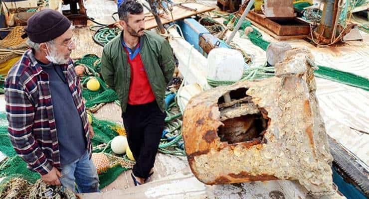 Muğla’nın Bodrum ilçesinde balıkçıların ağına, 200 kilogram ağırlığında, patlatılmış bir mayına ait demir parçası takıldı. 1. Dünya Savaşı’ndan kalma olduğu tahmin ediliyor.