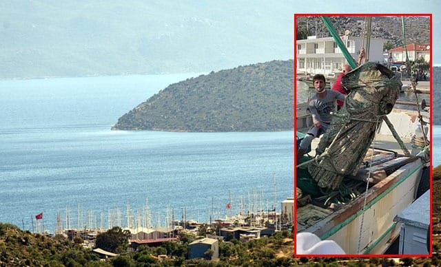 Ağlarına deniz ürünleri bekleyen balıkçılar çıkan heykeli görünce şaşkınlık yaşadı.