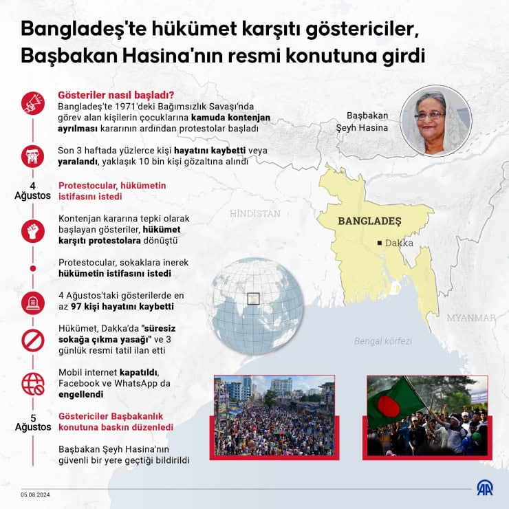 Bangladeş Başbakanı Şeyh Hasina, kendisini istifaya çağıran şiddetli protestoların ardından istifa etti.