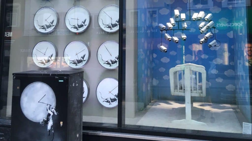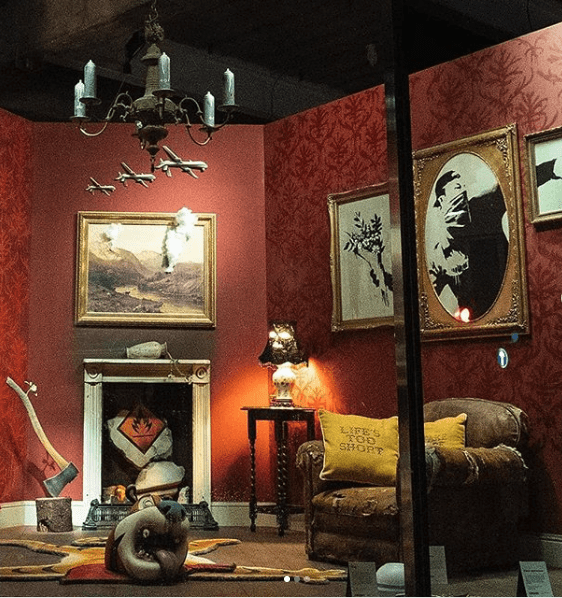 Kapalı devre kameralarla çevrili bir beşiğin bulunduğu oda ve Britanyalı rapçi Stormzy’nin finalinde sahne aldığı Glastonbury Müzik Festivali’nde giydiği Britanya bayraklı kurşun geçirmez yelek de sergilenen eserler arasında.