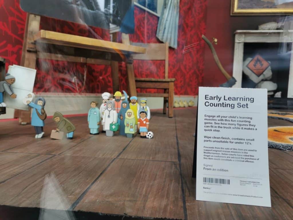 Son dönemdeki mülteci ölümlerine de dikkat çeken Banksy’nin Yunanistan’daki göçmen kamplarında tutulan kadınların diktiği paspasların üzerine can yeleklerinin kumaşlarından ipliklerle “Hoşgeldiniz” yazdığı paspaslar da vitrinde yer alıyor.