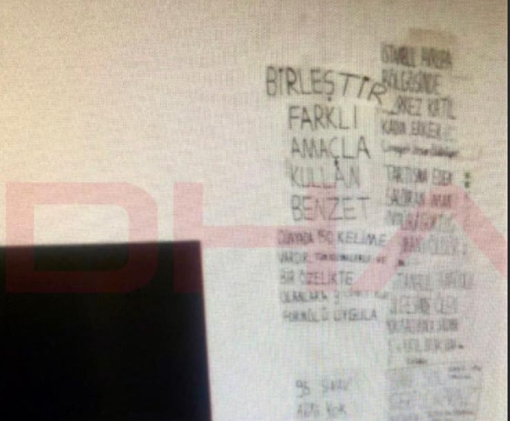 Camları gazete kağıtlarıyla kapatılan odanın diğer tarafındaki duvarda ise, “Birleştir, farklı amaçla kullan, benzet“, “İstanbul Avrupa bölgesinde herkes katil, kadın erkek, tartışma“, “Dünyada 50 kelime vardır“, “Sinirle kol vurma, tuzak kuruyor” gibi notlar göze çarpıyor.