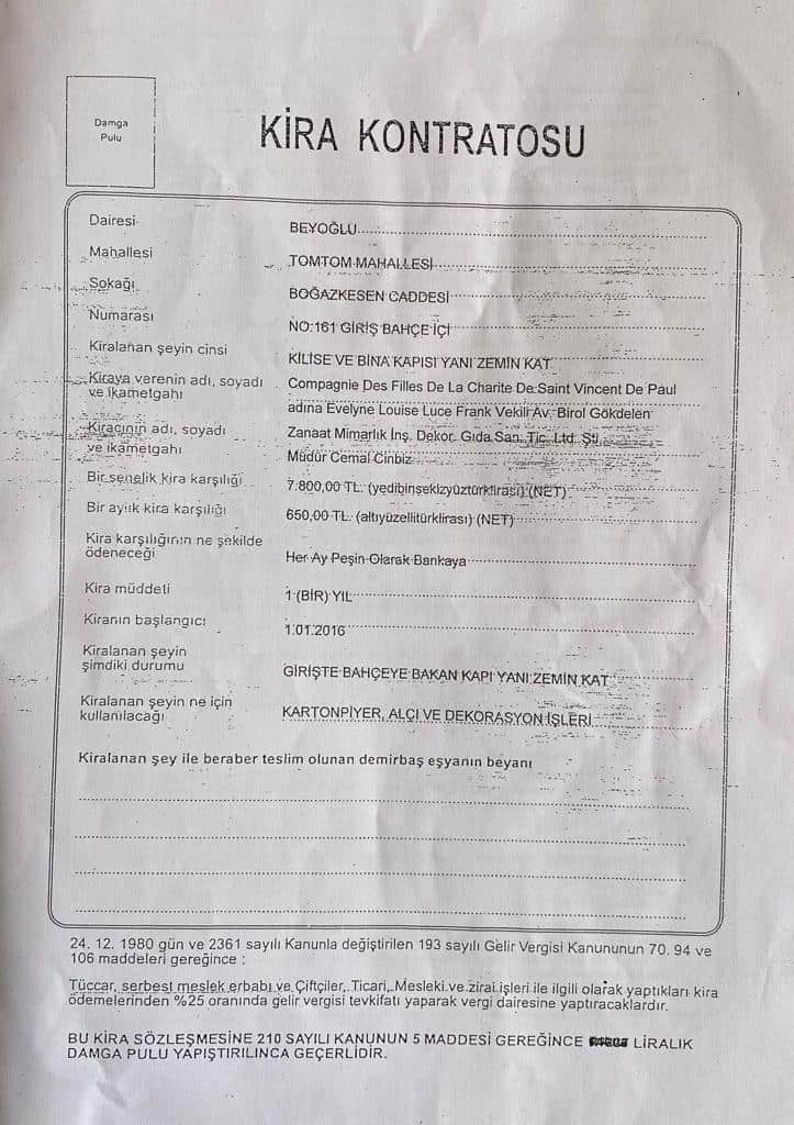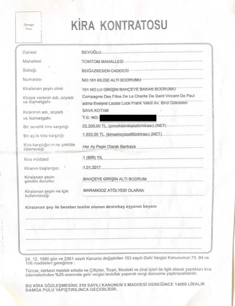 Cinbiz ve yine tahliyeye zorlanan Rum marangoz Sava Kotam, başkan Yıldız’ın yapıyı kullanan kişilerin kira sözleşmesi bulunmadığı iddiasını da 2016 ve 2017 tarihli sözleşmelerle yalanladı. Cinbiz ve Kotam’ın sözleşmesinde kiraya veren taraf Katolik topluluk Aziz Vincent de Paul’ün Hayırsever Kızları olarak görülüyor.