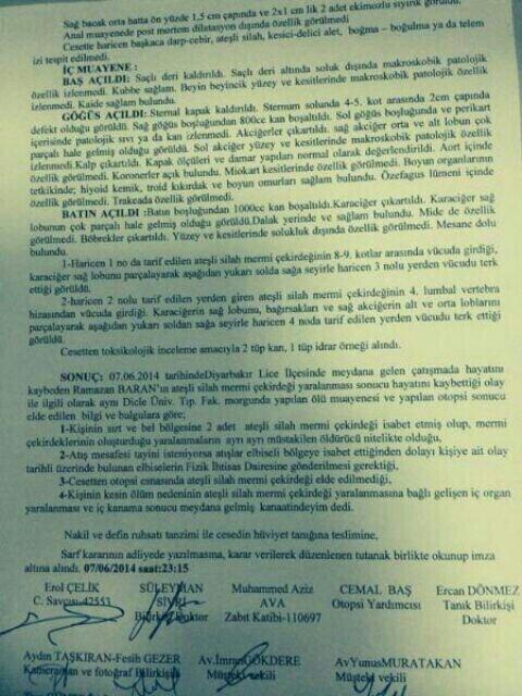 TSK’nın ‘Mevzilere sızmak isterken vuruldu’ açıklamasını yaptığı Ramazan Baran’ın otopsi raporunda sırt ve bel bölgesinden iki adet ateşli silah mermisinin vücuduna giriş yaparak ölümüne sebep olduğu, yani ‘sırtından vurulduğu’ belirtildi. Mevziye sızmak isteyen bir kişinin nasıl sırtından vurularak durdurulduğuysa anlaşılamadı.