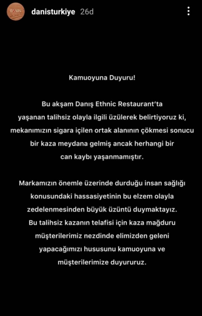 Restoranın açıklamasında ‘olaydan büyük üzüntü duyulduğu’ kaydedilerek şunlar yazıldı: “Bu talihsiz kazanın telafisi için kaza mağduru müşterilerimiz nezdinde elimizden geleni yapacağımız hususunu kamuoyuna ve müşterilere duyururuz.”