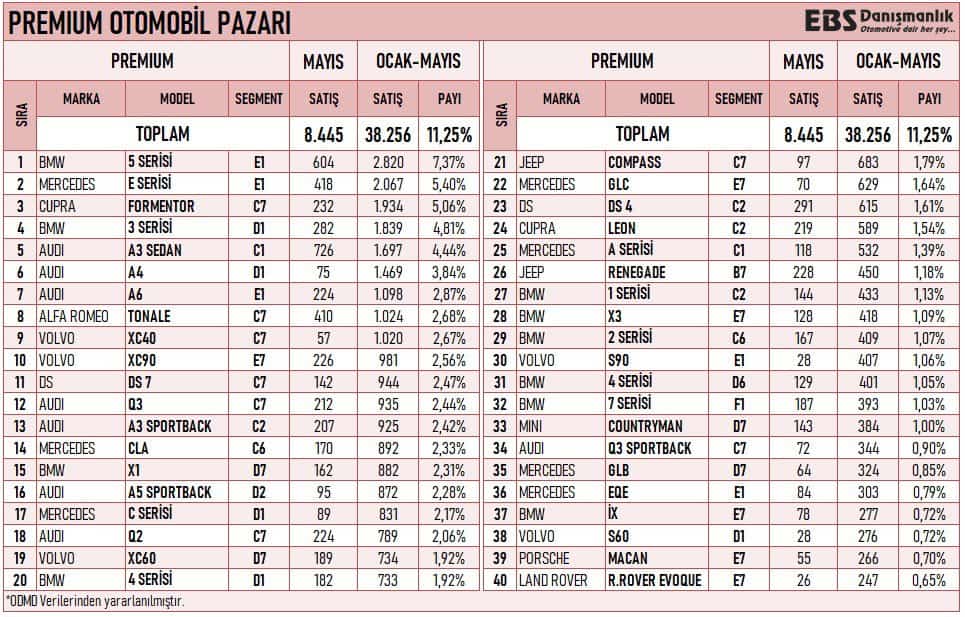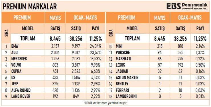 EBS Danışmanlık’ın hazırladığı ve otomotiv gazetecisi Emre Özpeynirci’nin paylaştığı verilere göre, 2023’ün mayıs ayında 8 bin 445 lüks araç satıldı. Yılın ilk beş ayında satılan lüks araç sayısıysa 38 bin 256. Bu, toplam araç satışının yüzde 11,25’ini oluşturuyor.