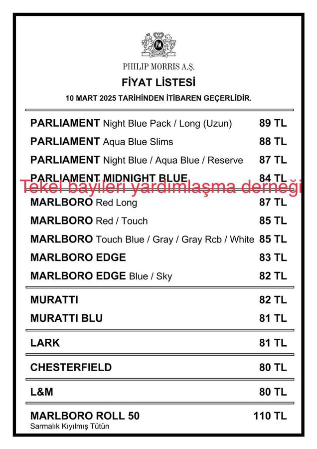 Yeni fiyat listesini Tekel Bayileri Yardımlaşma Derneği Başkanı Erol Dündar, X’ten paylaştı.