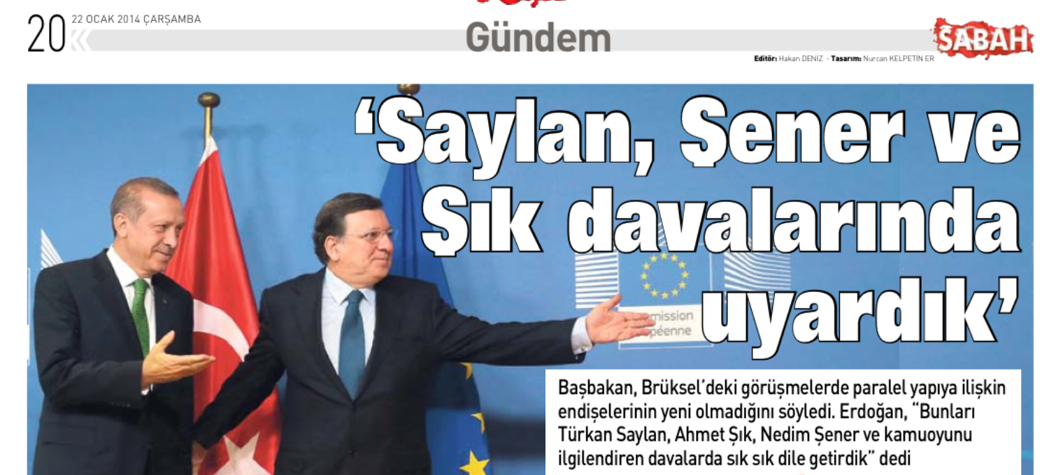 Şu satırlar 21 Ocak 2014 tarihli Sabah gazetesinde yayınlandı: “Başbakan Tayyip Erdoğan, AB-Türkiye ilişkilerinde kritik öneme sahip Brüksel ziyaretinde muhataplarına 17 Aralık operasyonu ve paralel yapıya ilişkin çarpıcı mesajlar verdi. Erdoğan, Türkan Saylan, Ahmet Şık, Nedim Şener olaylarında yaşanan çarpıklıkları anlattı, “Yargıya müdahale eleştirilerine karşı iyi niyetimizi koruduk. Bugün gelinen durum iyi niyetimizin suistimal edildiğini göstermektedir (…) Devletin içinde bir paralel yapı var. Bununla ilgili endişemiz bugüne has değil. İki yıldır endişemiz vardı. Türkan Saylan, Ahmet Şık, Nedim Şener ve kamuoyunu ilgilendiren davalarda sık sık dile getirdik. Ancak yargıya müdahale eleştirilerine karşı iyi niyetimizi koruduk. Bugün gelinen durum iyi niyetimizin suistimal edildiğini göstermektedir.”