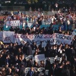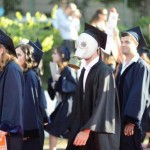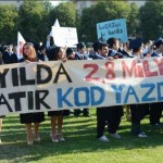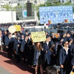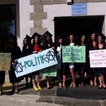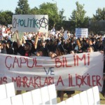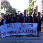 Öğrenciler, tören geçişi sırasında, ‘Halkız biz yeniden doğarız ölümlerde’, ‘Kaza değil cinayet’, ‘Durmadan düşünüyorum; ne kadar çok öldük yaşamak için Roboski, Gezi, Lice, Soma’da’, ‘Yap işlet devret babacım’, ‘İşletmeyi sıfırladık babacım’, ‘301 (?) insanın bir avuç ettiği ülkede, 1 Reza kaç matematikçi eder?’, ‘Çapulculuk genetiğimizde var’, ‘Kızlı erkekli mezun oluyoruz’, ‘Biz egoyu sizden iyi biliriz’, ‘Devletin açtığı yaraları psikologlar saramaz’, ‘Sayılmayız parmak ile tükenmeyiz kırmak ile’ yazan pankartlar açıp, dövizler taşıdı.