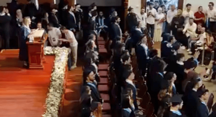 Diploma dağıtım töreninde Şahin konuşma yapmak için sahneye geldi. Öğrenciler o sırada kürsüye sırtını döndü.