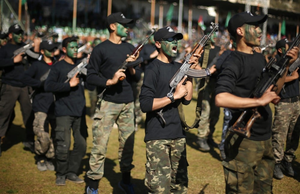 Palestinian youths hold weapons during a military-style graduation ceremony after being trained at one of the Hamas-run Liberation Camps, in Gaza City January 29, 2015. Hamas’s armed wing organized “Liberation Youths Camps” for young Palestinians aged between 15 and 21 to prepare them to “confront any possible Israeli attack”, Hamas officials said. According to organizers, some 17,000 youths graduated from these camps. REUTERS/Suhaib Salem (GAZA – Tags: MILITARY POLITICS)