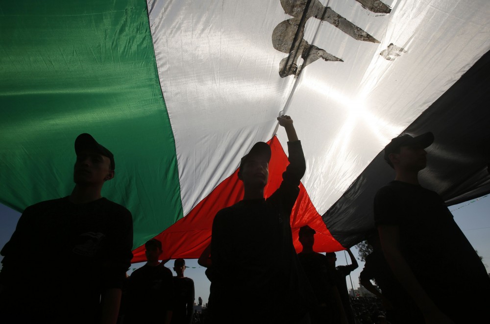 Palestinian youths stand under a large Palestinian flag during a military-style graduation ceremony after being trained at one of the Hamas-run Liberation Camps, in Gaza City January 29, 2015. Hamas’s armed wing organized “Liberation Youths Camps” for young Palestinians aged between 15 and 21 to prepare them to “confront any possible Israeli attack”, Hamas officials said. According to organizers, some 17,000 youths graduated from these camps. REUTERS/Suhaib Salem (GAZA – Tags: MILITARY POLITICS)