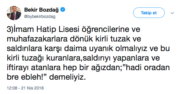 Bozdağ şöyle devam etti: “İmam Hatip Lisesi öğrencileri ve bilumum muhafazakarlar hülasa Müslümanlar; Kuran ve sünnetin tavsif ettiği şekilde Allah’a, peygamberlere, meleklere, kitaplara, ahirete, kaza ve kadere iman ederler. İslam’ın her bir hükmünü tereddütsüz kabul ederler. Belli ki İHL’lerin yetiştirdiği nesillerden ve muhafazakarlardan rahatsız olanlar, onları itibarsızlaştırmak ve kendi içinde ayrıştırmak ve nihayetinde onları islam’dan uzaklaştırmak isteyenler işbaşındalar. Ama başaramayacaklar. Her zaman ki gibi kaybedecekler…”