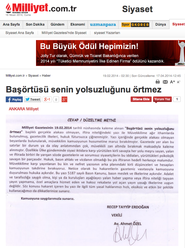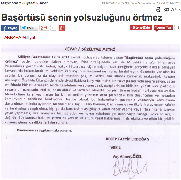 Milliyet de bu sözleri ertesi gün gazete ve sitesinde haberleştirmişti. Ancak haber şu an Milliyet’in internet sitesinde yok. Onun yerine yine Erdoğan’ın avukatı Ahmet Özel’in imzasını taşıyan bir ‘düzeltme’ metni var.