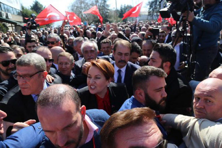 Akşener, Kocaeli Aydınlar Ocağı’nın Fuar Alanı’nda ‘Milli İradeye Saygı’ adıyla düzenlediği etkinlikte konuşma yaptığı sırada 40-50 kişilik bir grup etkinliği bastı.