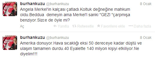 TBMM Anayasa Komisyonu Başkanı Burhan Kuzu, son günlerde yaşanan tüm gelişmeleri Gezi Direnişi’ne bağlama modasını bir adım öteye taşıdı. Burhan Kuzu, Gezi eylemleri sırasındaki polis şiddeti nedeniyle hükümeti eleştiren Almanya Başbakanı Angela Merkel’in geçirdiği kayak kazası hakkında şu tweeti attı: “Angela Merkel’in kalçası çatladı. Koltuk değneğine mahkum oldu. Beddua demeyin ama Merkel’i sanki “GEZİ” çarpmışa benziyor. Sizce de öyle değil mi?” dedi. Kuzu bu tweetle sosyal medyada tartışma yaratırken, “Merkel’in geçirdiği kazayı ilahi adalete bağladı” yorumu yapıldı.